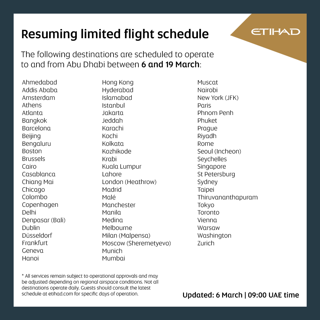 与此同时,阿提哈德航空表示,将恢复飞往约70个目的地的航班。两家航空公司自本周起也承担了一部分撤离和旅客疏散航班,并在有限条件下恢复部分商业运营。