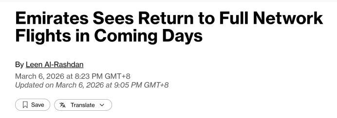 北京时间3月6日晚间,阿联酋航空最新宣布,将在未来几天恢复全面网络运营,但需视空域可用性和运营需求而定。
