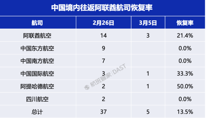 根据航班管家DAST数据,3月5日中国—阿联酋航线恢复率仅为13.5%,而中国—沙特航线恢复率已达到42.9%。