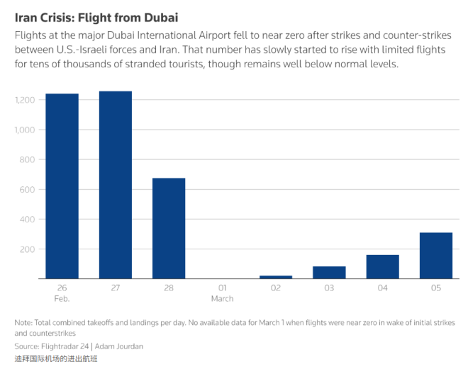 航班追踪网站 Flightradar24 的数据显示,截至3月5日,迪拜机场的客流量已经明显回升,但整体航班数量仍仅为正常水平的大约四分之一。