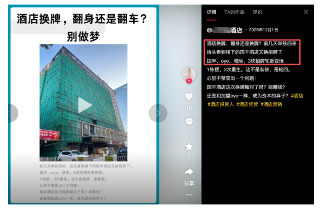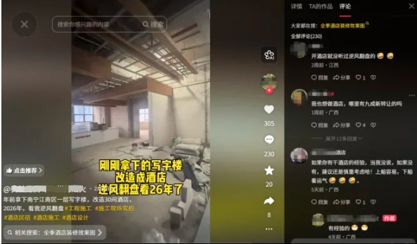 笔者随手打开抖音,就看到一个勇敢的博主,说是年前砸300万拿下了南宁江南区的一层写字楼,想改成30间酒店,并配文称:2026年,看我逆风翻盘。