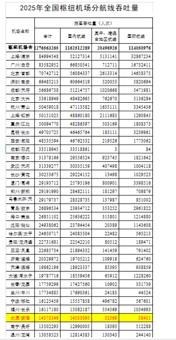 根据民航局公布的2025年全国枢纽机场分航线吞吐量数据,太原机场国际旅客占比约0.26%,国内航线客源高度集中在北上广深等国内枢纽,商务与跨境散客支撑薄弱,国际航线占比偏低。
