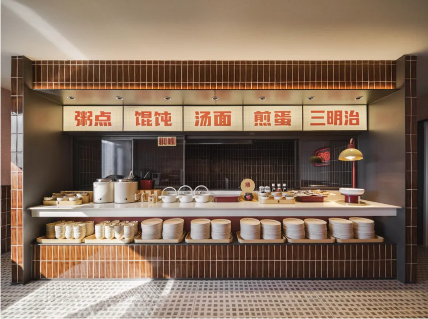 早餐厅的装饰很直接,“吃好”“喝好”的标识,还有“馄饨”“汤面”的灯牌,简单明了,却又不失设计感。