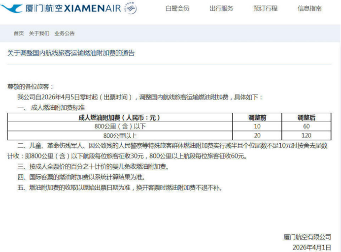 但仅仅一天后,4月1日,厦门航空、中国联合航空等航司正式发布通告,确认了此前的涨价标准。