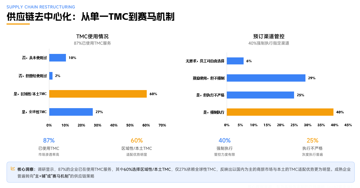 在这一链条中,作为中间方的 TMC(商旅管理公司)正面临微妙的生死局。李瀚明指出,现在的企业客户不再满足于单一服务。调研显示,60% 的公司已经开始引入多家 TMC 竞争,或者允许员工在其他平台比价。