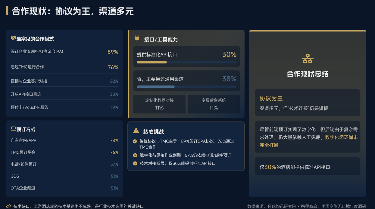 李超强调,技术连接依然是目前最大的障碍。调研显示,目前仅有约30%的酒店能提供 API 接口与 TMC 直连,大部分酒店仍依赖邮件或电话这种低效方式预定。